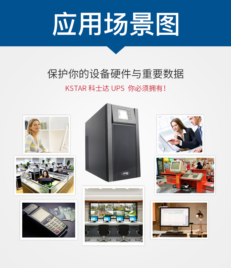 具有LCD中文液晶显示功能的科士达YDC9300系列 UPS,是科士达公司针对以企业级中小型数据中心为代表的关键负载而推出的10KVA~20KVA功率段三进单出在线式UPS产品,可为用户的企业局域网、高端服务器和网络设备、数据中心机房以及其它精密工业仪器提供高可靠电源保护。